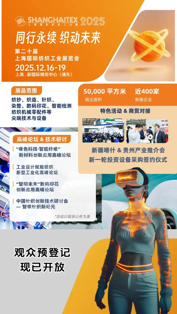 第二十届上海国际纺织工业展览会(ShanghaiTex 2025),将于2025年12月16日-19日在上海新国际博览中心精彩绽放!汇集纺织机械、智能技术、新材料等领域核心力量,部分参展企业已新鲜出炉~