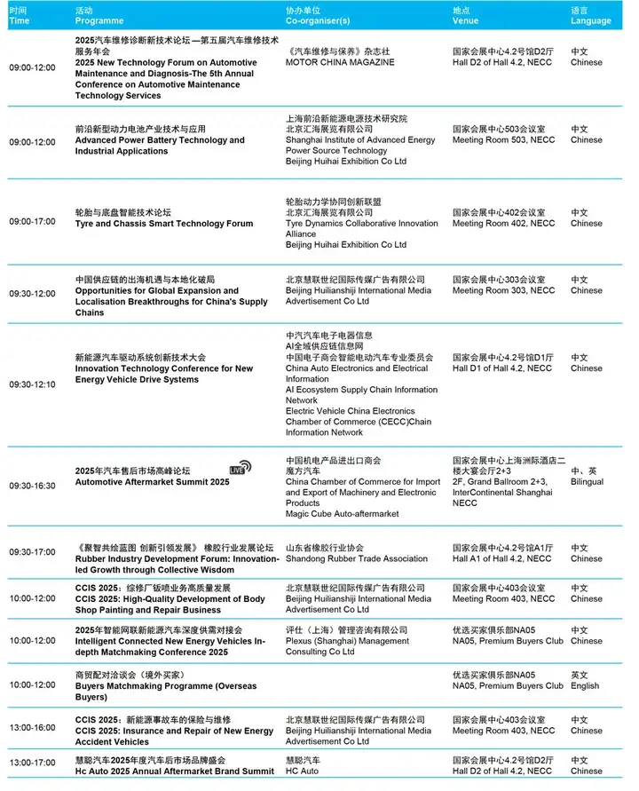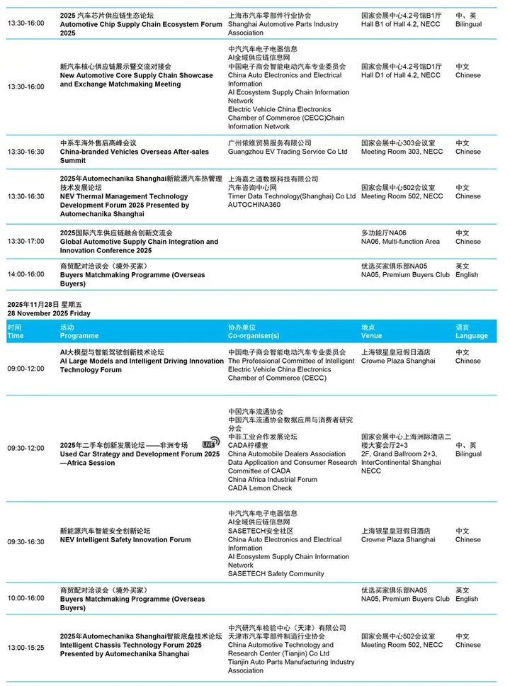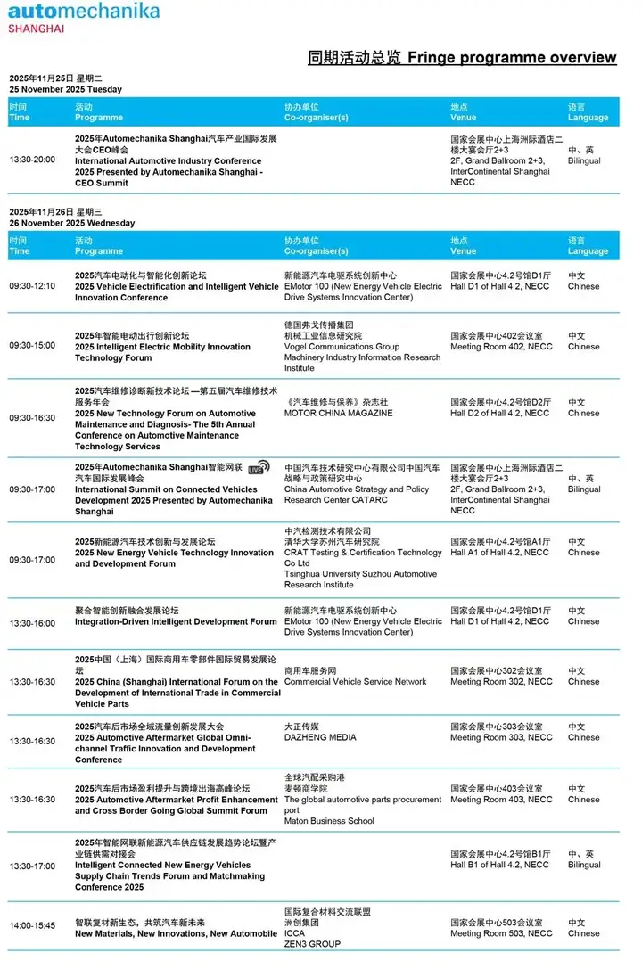 2025年Automechanika Shanghai再度迎来规模新高,同期活动将已达94场,涵盖高质量论坛会议、培训讲座及互动体验。面对汽车产业快速转型带来的挑战与机遇,本届展会同期活动新增多场聚焦技术革新、人才培养、产业链供需对接、跨国投资及全球合作的专题系列会议围绕当前国际贸易形势与提升竞争力的策略,深入探讨行业发展的前瞻思路。