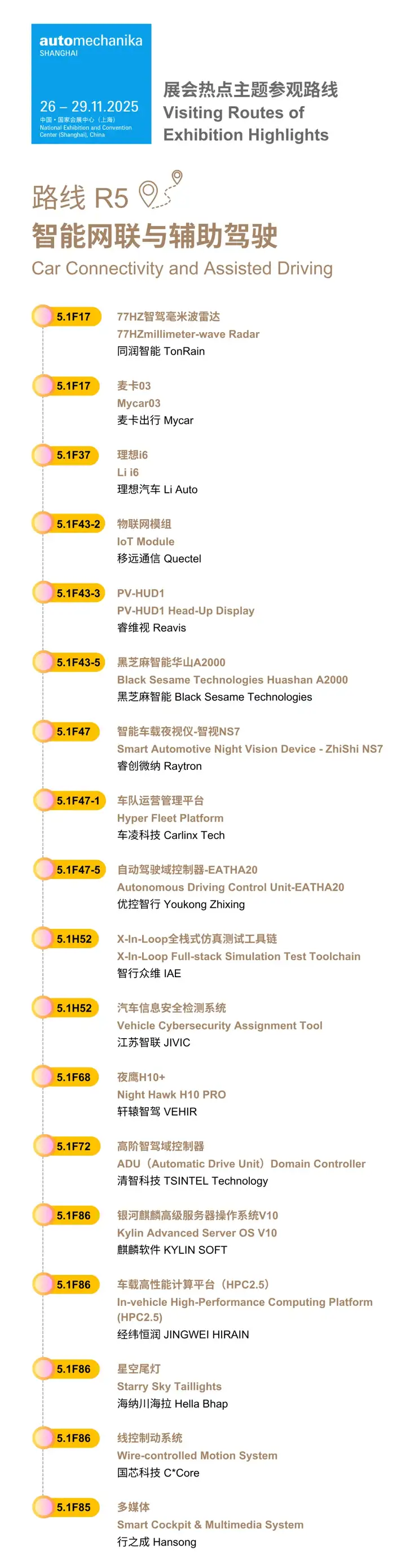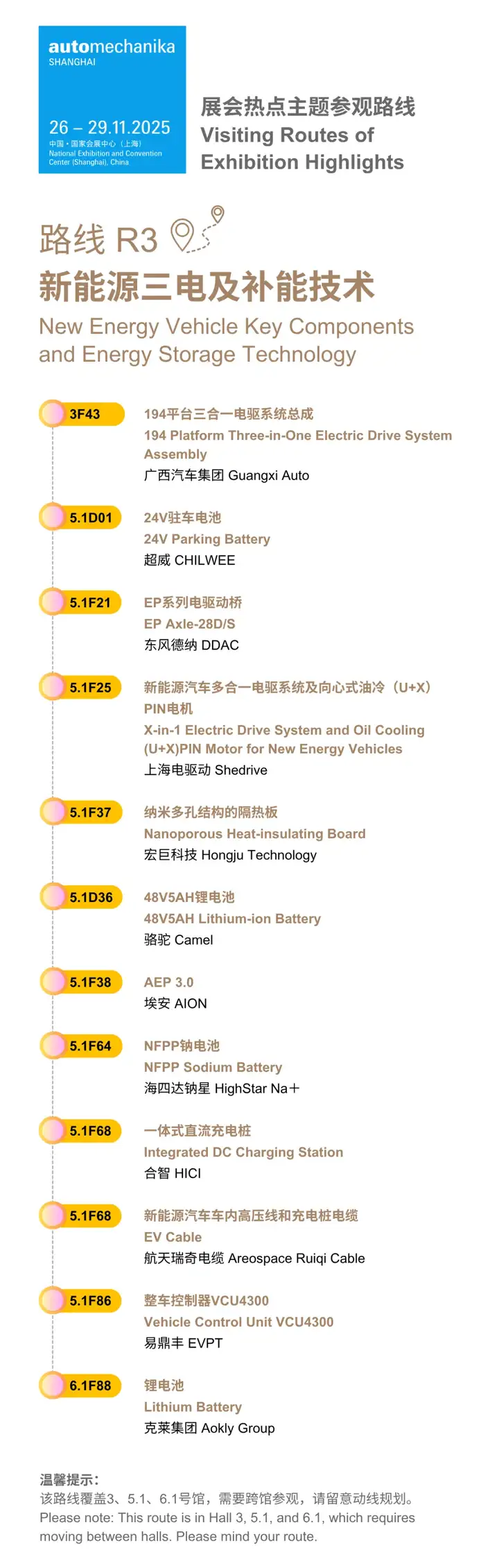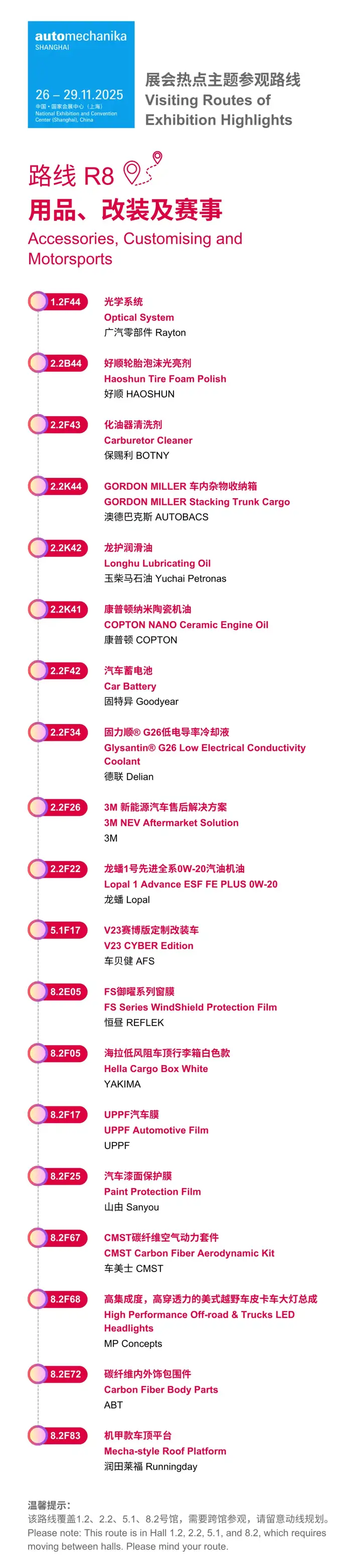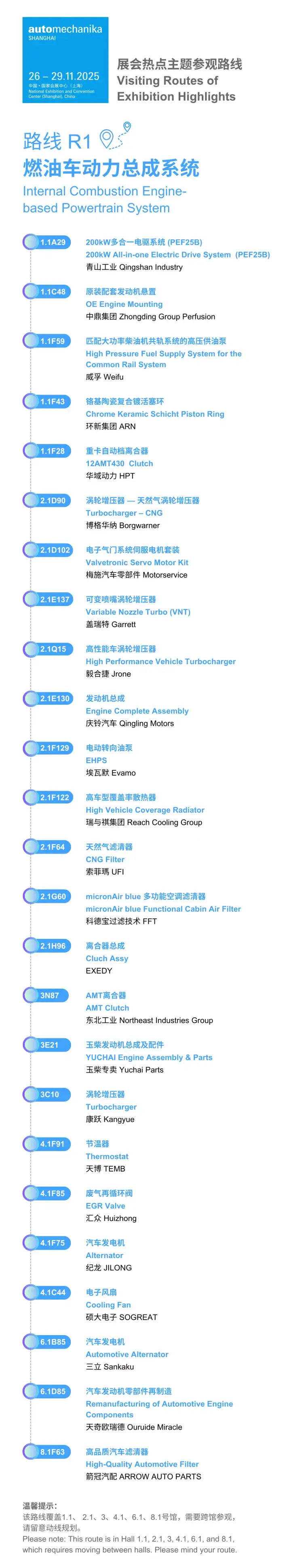 展会主办方特别策划的热点主题参观路线,助力观众高效探索产品技术创新成果。这些路线清晰呈现燃油车动力总成系统、新能源三电及补能技术、智能底盘系统、新能源整车热管理、智能网联与辅助驾驶、汽车数字解决方案、绿色维修及轮胎轮毂、用品/改装及赛事共八个细分方向,协助观众快速定位各领域的重点展品,实现高效产业资源对接。