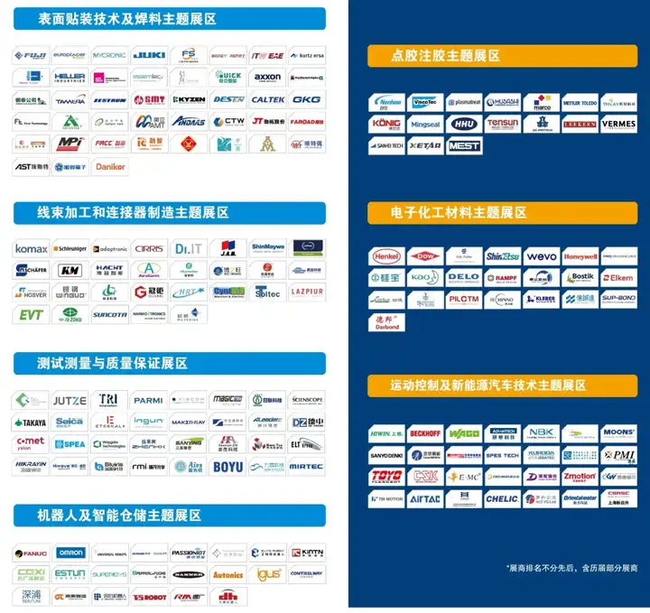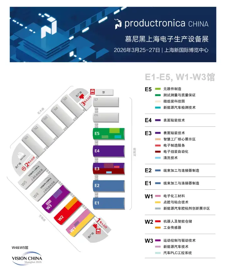 展会将继续在E1-E5及W1-W3馆举办。各展馆依据展品类别与应用领域进行细致划分,布局科学合理,助力展商精准展示核心优势,方便观众高效锁定目标产品。展品范围覆盖电子制造全产业链,包括:电子与化工材料、点胶与粘合技术、电子组装自动化、测试测量与质量保证、电子制造服务(EMS)、表面贴装技术(SMT)、线束加工与连接器制造、元器件制造、运动控制与驱动技术、工业传感器、机器人及智能仓储等,一站式呈现智能制造与电子创新产业链的全球前沿技术与产品。