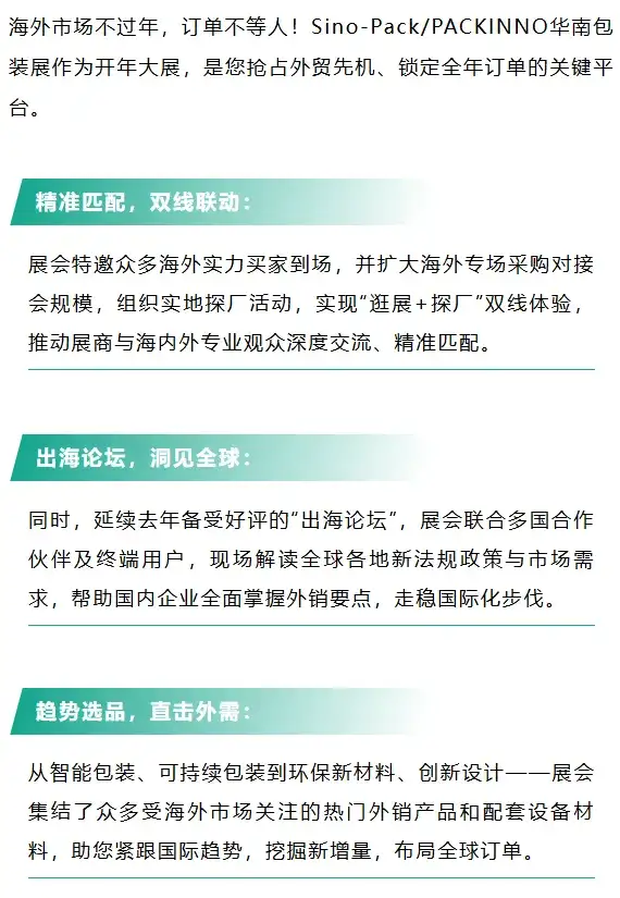 2026年Sino-Pack/PACKINNO华南包装展不仅是一场技术盛会,更是企业把握趋势、对接资源、拓展市场、链接全球、布局未来的战略平台!无论您是寻求转型升级的制造商、寻找创新方案的包装企业,还是布局新兴市场的终端品牌商,这都将是您2026年不可错过的行业盛会。