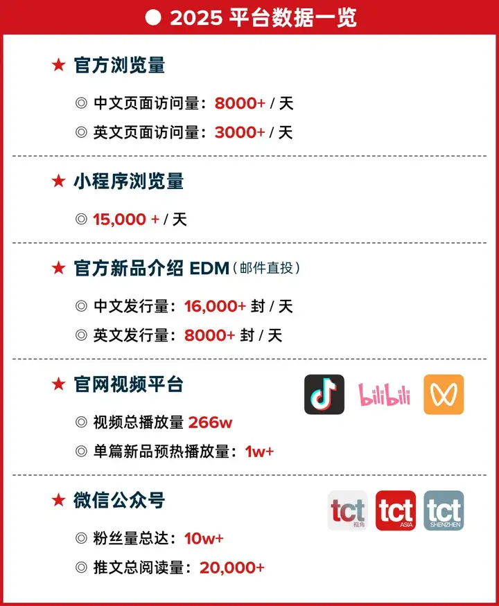 TCT亚洲展的数字化平台为展商带来了多元化的市场推广工具,最大化展会的营销效益。我们通过线上渠道为参展商提供了跨越时间与地域限制的曝光机会,确保在展会期间、展会前后的各个时段都能持续吸引潜在客户的关注。