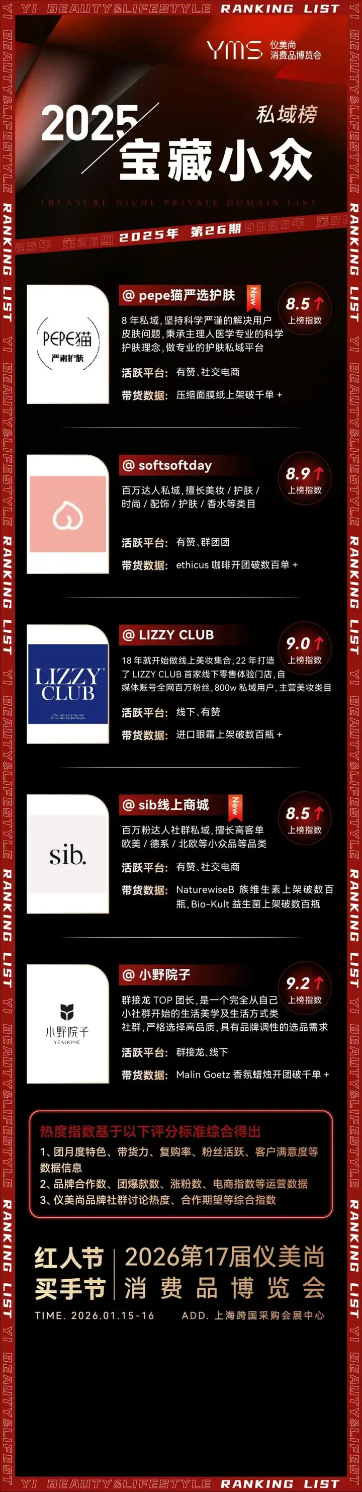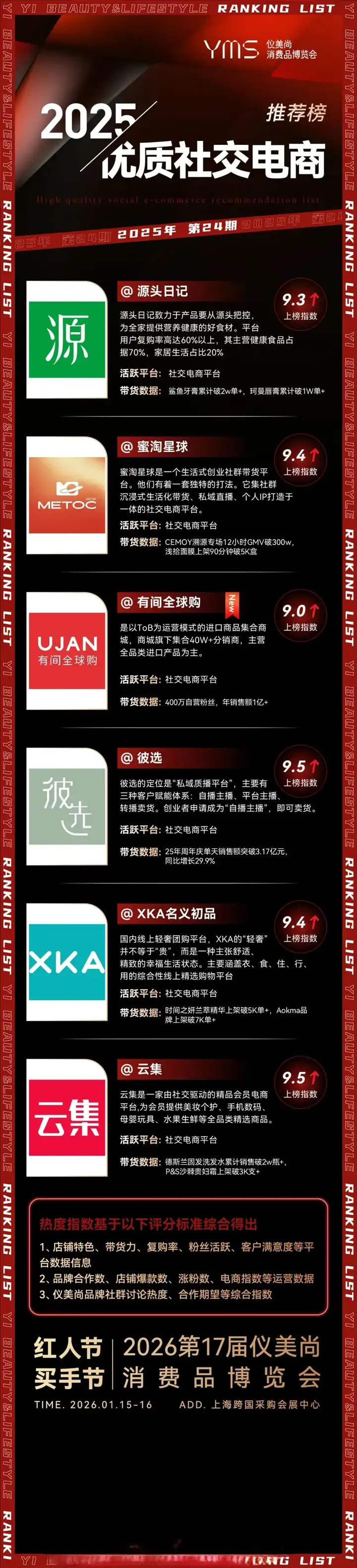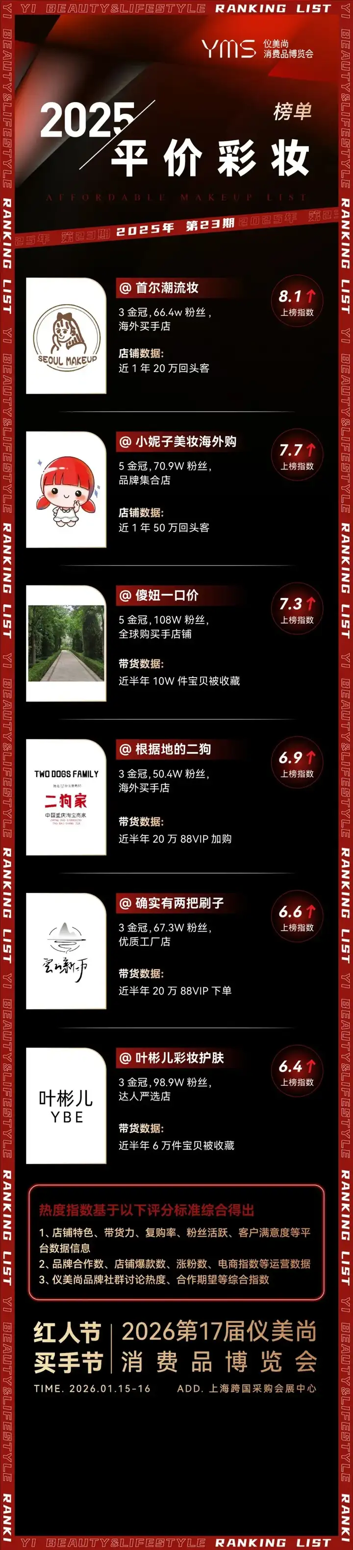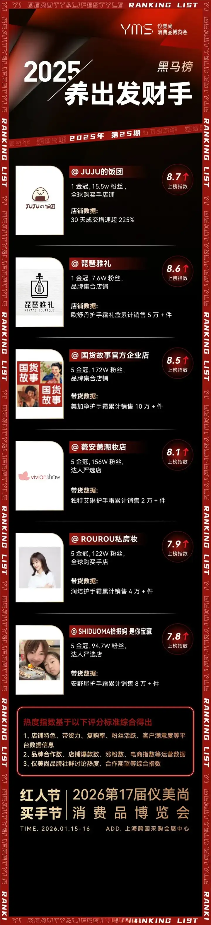 所有榜单均以客观真实的数据为核心支撑,综合考量店铺/团特色、带货能力、用户复购率、粉丝活跃度、客户满意度等平台核心数据,结合品牌合作规模、店铺爆款数量、涨粉增速、电商运营指数,以及仪美尚品牌社群讨论热度、行业合作期望等多维度关键指标进行综合评分,为参展伙伴提供高价值的合作决策参考。
