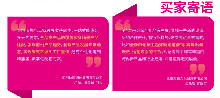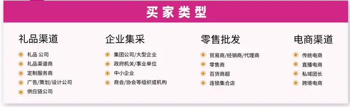 买家质量高,以礼品公司、经销代理商、电商/跨境电商、终端集采为主,吸引全国31个省市地区买家齐聚,100+协会、专业市场及行业媒体到场交流,被行业人士一致认为是年度必赴盛会。