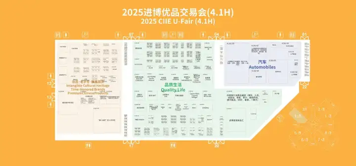 4.1H:主要展示消费品、汽车等。消费品包含美妆日化、健康护理、家用电器、家居用品、服装服饰、潮玩玩具、体育用品、珠宝等品类;汽车包含新能源车、燃油车、经典车等产品,另设有非遗、老字号、精品国货专区。