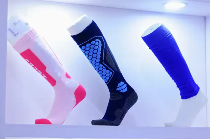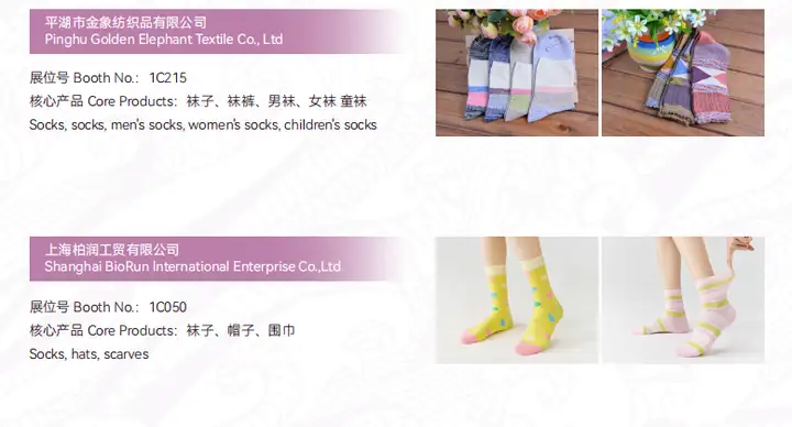 成品袜展区:展示各类户外运动、潮流少女、商务休闲等市场细分赛道的最新款棉袜、丝袜、袜裤等成品袜。