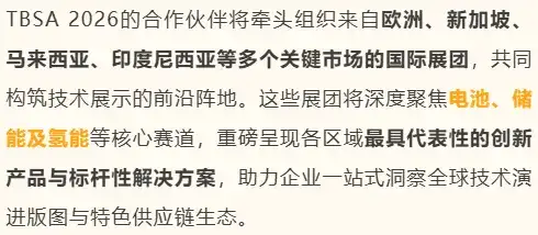 从技术创新到市场落地,从本土布局到全球扩张,TBSA 2026正以全球化的视野和资源,推动电池储能产业的深度变革。未来,这场盛会将持续成为链接全球产业资源的核心枢纽,助力更多中国企业扬帆出海,在国际市场书写新的产业篇章。3月10-12日,香港亚洲国际博览馆,邀你共同见证行业新未来!