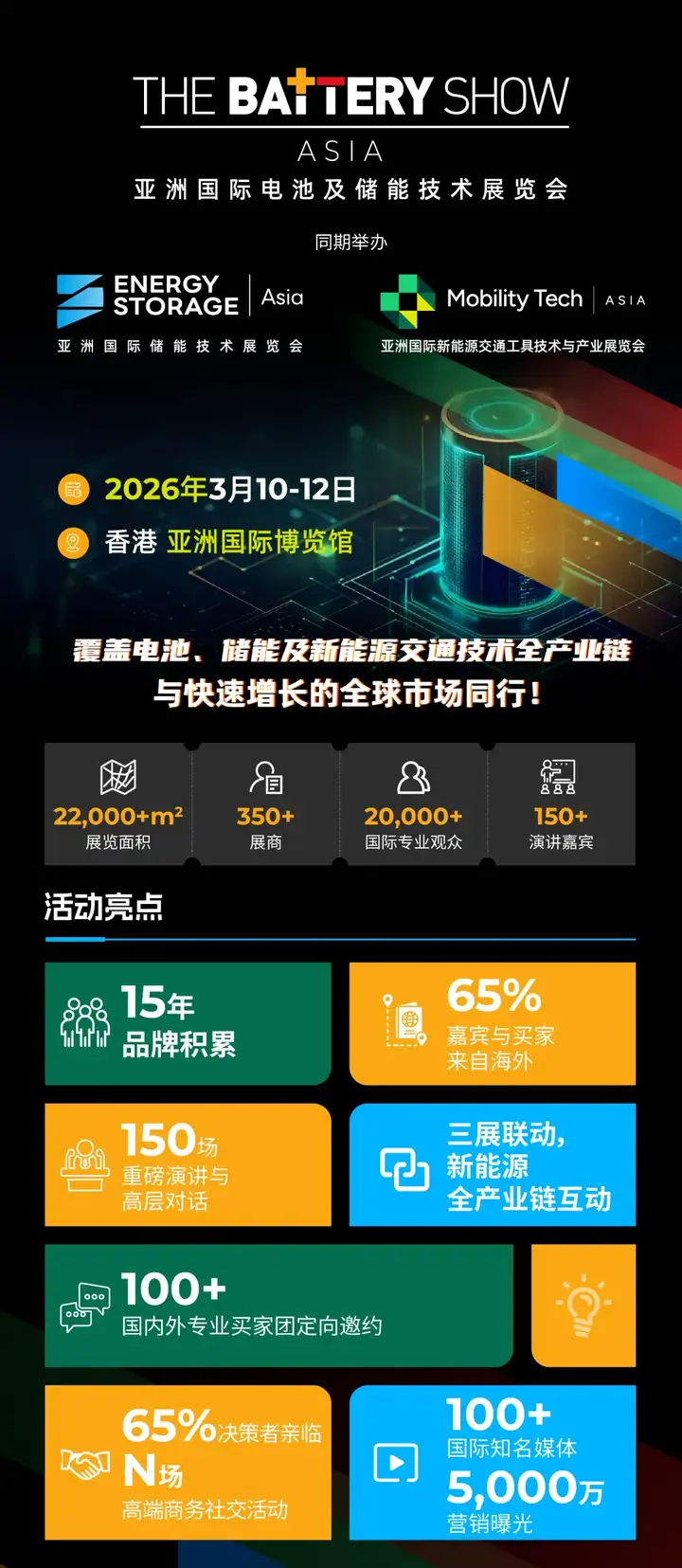 随着电池与储能产业跃升为新能源领域核心增长引擎,东南亚、欧美等区域正释放千亿级采购需求,一场聚焦全球资源整合、助力企业出海破局的行业盛会已箭在弦上。The Battery Show Asia 2026亚洲国际电池及储能技术展览会将于2026年3月10-12日登陆香港亚洲国际博览馆,届时将汇聚20,000+名电池制造、储能解决方案及新能源交通领域的政策制定者、技术先锋、工程师与行业领袖,其中65%嘉宾与买家来自欧美、日韩、东南亚、印度、中东等全球核心市场,打造技术展示与商业合作的全球化顶级平台。