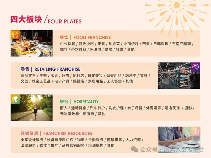 同时,我们不遗余力地组织品牌评选、行业高峰论坛、品牌路演、专题对接会、加盟公开课等多种专业同期活动,实现连锁品牌与专业买家的前沿商业信息对称。为参会企业和专业观众深入了解连锁市场热点和加盟投资趋势提供了一个平台。