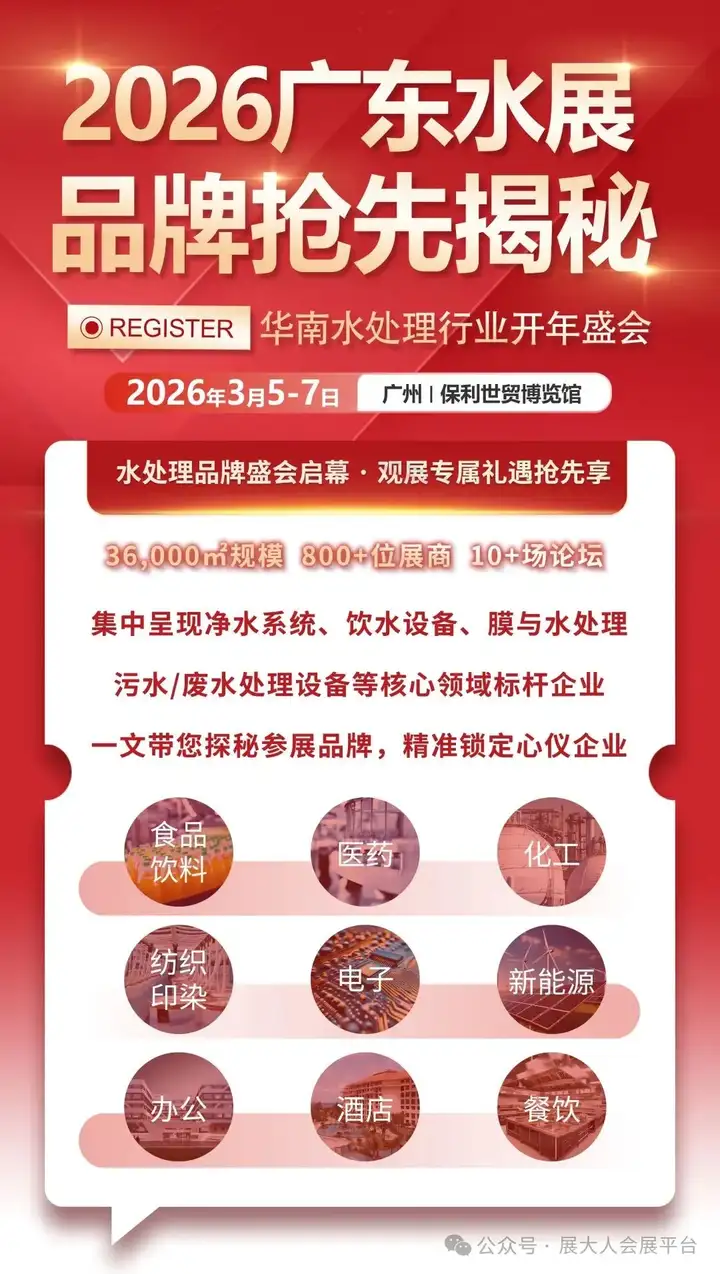 即刻锁定观展席位,与全行业伙伴共探水处理发展新机遇,抢占开年商贸对接先机,在华南水处理行业的开年重头戏中,解锁属于你的产业新蓝图!2026广东水展,3月5-7日,广州保利世贸博览馆,我们不见不散!