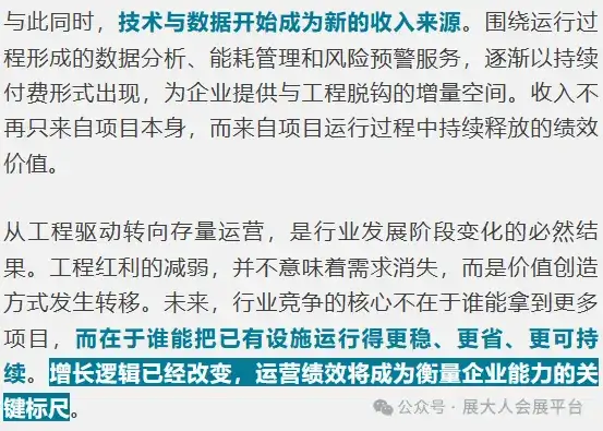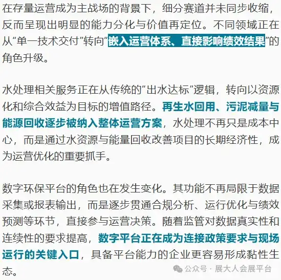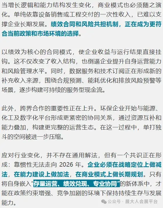 迈入 2026 年,环保产业将彻底进入“存量运营+绩效驱动+专业分化”的新阶段。过去依赖增量工程和外部推动的逻辑不再适用,企业能否在政策约束下实现长期价值,取决于战略定位、运营能力与商业模式的重构。头部企业通过整合资源形成规模优势,细分赛道凭借专业技术提升附加值,而数据化、智能化运营将成为新常态。顺应政策约束、优化存量运营、强化专业能力,将是企业在 2026 年保持竞争力的关键所在。