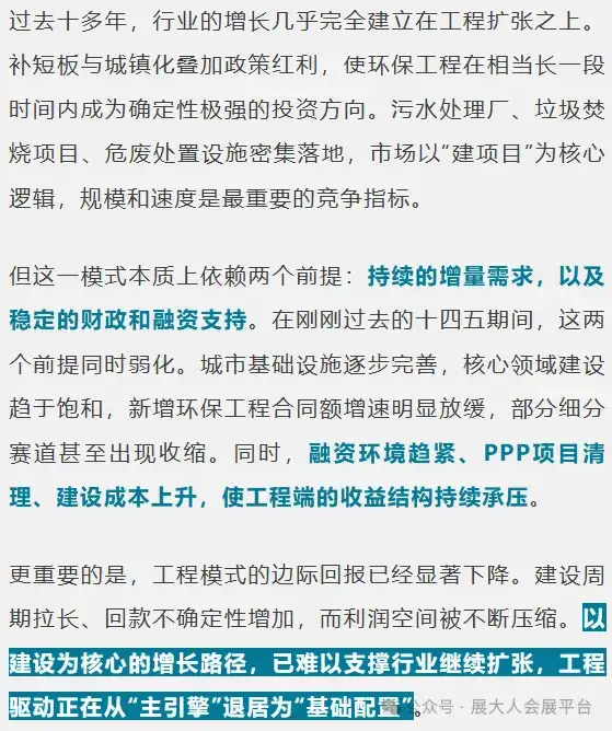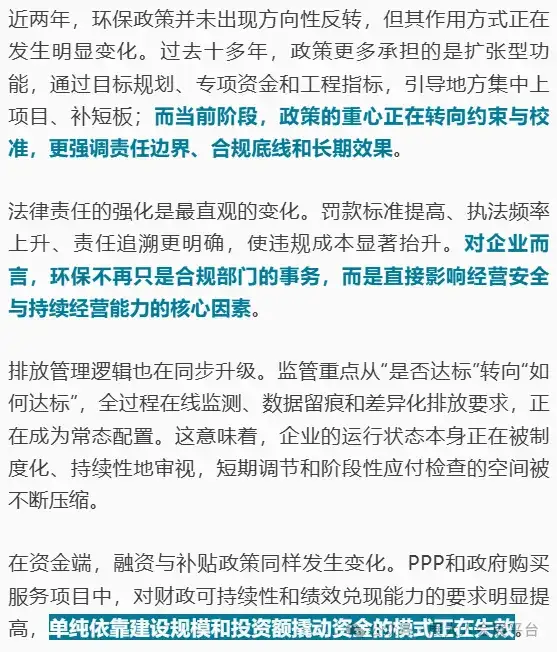 导语:2026年,环保产业正式告别政策驱动的增量扩张时代,迈入存量运营、绩效驱动、专业分化的深度调整新阶段。政策细则收紧、排放标准精细化、融资补贴锚定可持续绩效,增量工程机会收窄,行业格局加速重构,唯有以专业能力夯实运营根基、以模式创新适配市场新序,方能在变革中站稳脚跟。