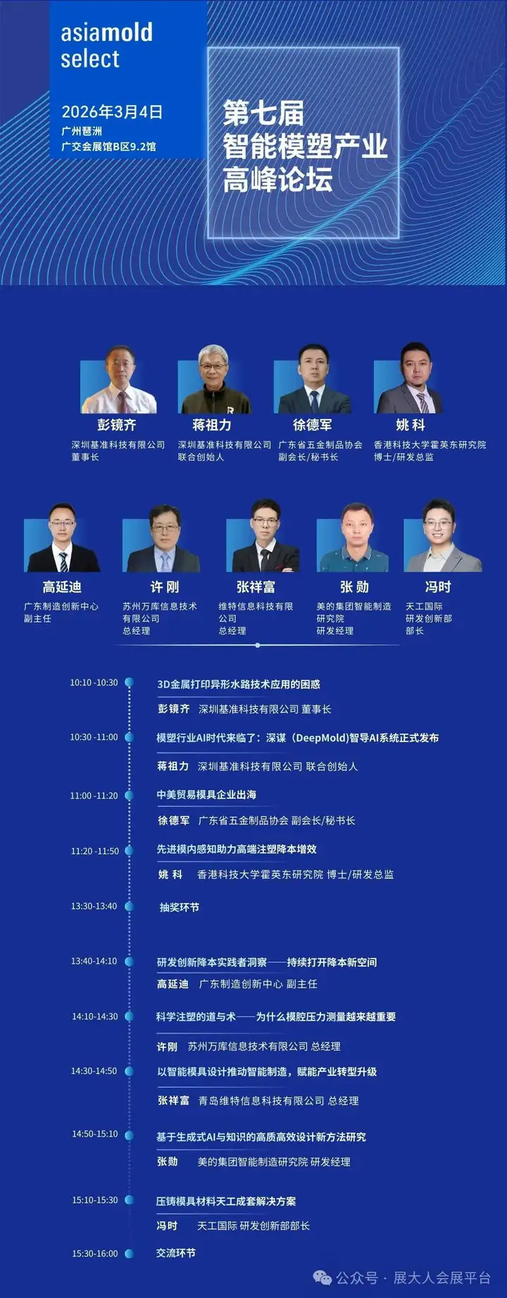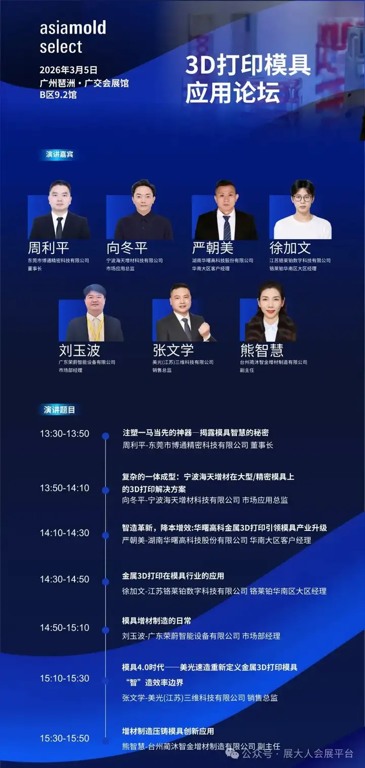 聚焦模具与智能制造前沿,2026 Asiamold Select 亚洲模具展将于3月4-6日登陆广州广交会展馆B区9.2馆。本届展会携手SPS广州国际智能制造展、广州工业科技展三展同台,总面积达40000平方米,为行业呈现一场高规格、全产业链的工业商贸盛会,观展攻略速收藏!