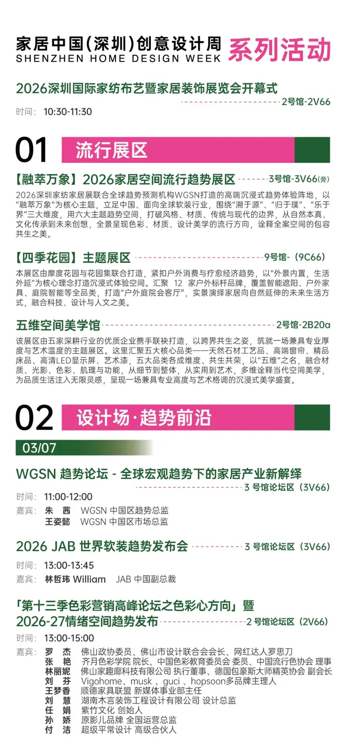 🔮 趋势与发布:本届展会还重磅携手全球权威趋势机构WGSN,联合打造沉浸式立体趋势实验室,以“融萃万象”为年度主题,设立「归于璞、溯于源、乐于界」三大板块与六大情景空间呈现材质自然回归、工艺摩登重塑、色彩跨界玩趣。让参观者抢先掌握2026全球家居流行趋势和行业数据,让设计决策有据可依。