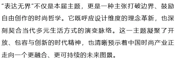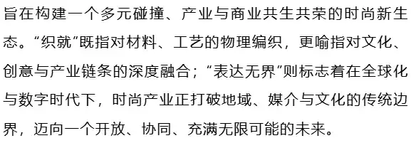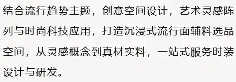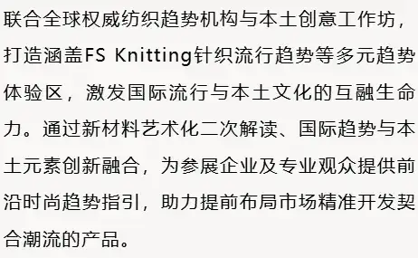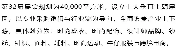展品范围:纱线、面料、辅料、针织、大衣、羽绒服、皮衣皮草、潮流女装、家居服、牛仔、内衣、配饰、鞋包、时尚运动及原创设计