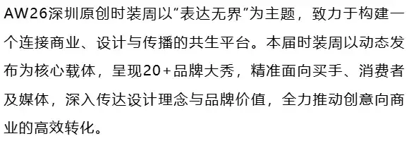 深耕服装供应链多年,FASHION SOURCE 早已成为行业公认的专业风向标,始终以前瞻视野引领趋势,以持续创新响应市场变革。2026年4月15-17日,第32届FASHION SOURCE时尚之源深圳展将于深圳会展中心(福田)重磅启幕,携手AW26深圳原创时装周双IP联动,为全球纺织服装产业带来一场集商贸、趋势、交流于一体的年度盛会。