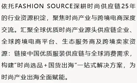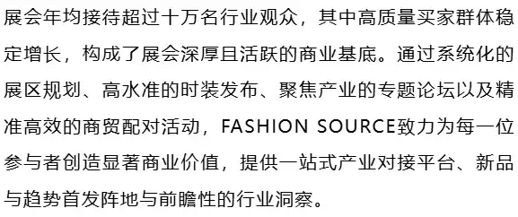 FASHION SOURCE时尚之源深圳展自2001年创立至今,始终深植于粤港澳大湾区,专注服务服装全产业链,已成为一个连接创意、商业与产业的标杆性平台。在这里,新季首秀、订单落地、战略牵手在同一时空高频发生,共同织就当代中国服装产业的生动图景与未来脉络。