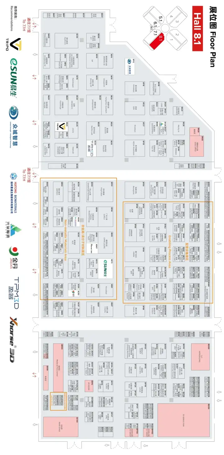 02、8.1号馆聚焦3D打印全产业链,汇聚:HP、嘉立创、先临三维、知象光电、思看科技、积木易搭、远铸智能、拓竹科技、原子重塑、创想三维、Elegoo、Snapmaker、Stratasys、美光速造、闪铸科技、Raise3D复志科技、盈普三维、起迪、纵横增材、潮阔科技、Formlabs、赛纳三维、黑格科技、奇遇科技、Polymaker、eSUN易生、拓博、摩方精密、爱丽兹、三绿、Kexcelled、家联科技、博理科技、乾度高科、查克科技、Phaetus、纳维加特、Anisoprint、长江工研院、CFSYS、APLUS、中观ZG、精亮科技、元嘉生物、埃尔泰克、Markforgde、Hitem 3D 、Meshy AI、万晟智造、曼界创意、Xhorse 3D、丰原生物、零犀智造、领科汇创、、喜马拉雅、Tripo AI、万华化学等品牌。