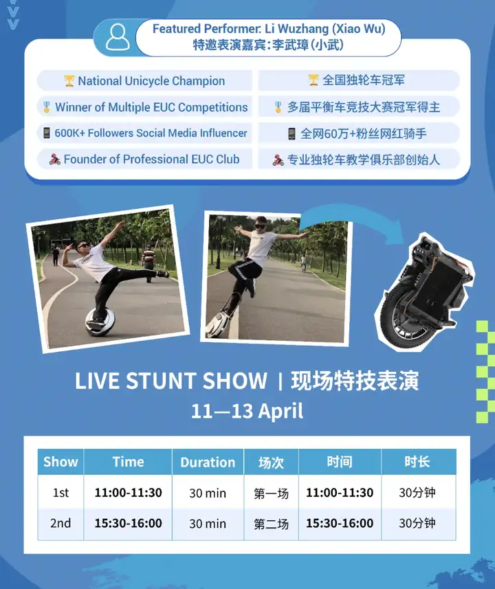 现场更设独轮车特技表演:60W+ 粉丝顶流骑手亲临,连续三日挑战独轮车技极限,呈现多场心跳加速的视觉盛宴。