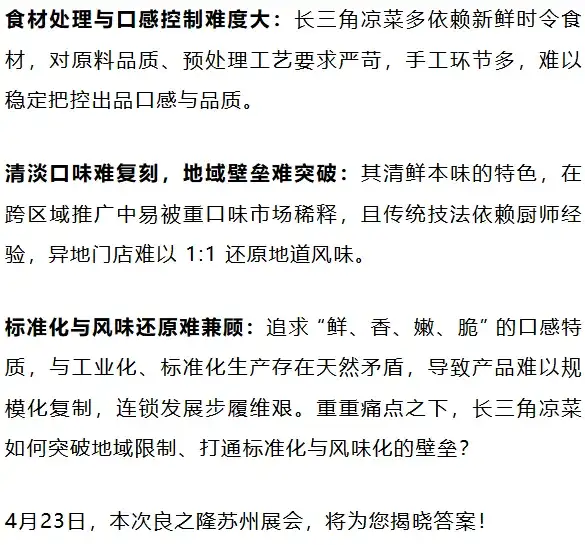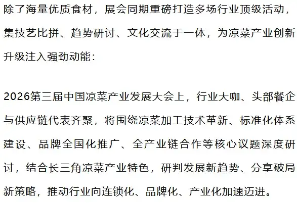 4月23-25日,良之隆·2026第五届中国江苏菜食材电商节将在苏州国际博览中心隆重举办!作为聚焦长三角凉菜产业的标杆盛会,展会以凉菜食材为核心,集结全国优质资源与创新产品,通过专业展示、巅峰赛事与深度交流,直击行业发展难题,为凉菜产业标准化、连锁化、规模化发展提供一站式破局思路。