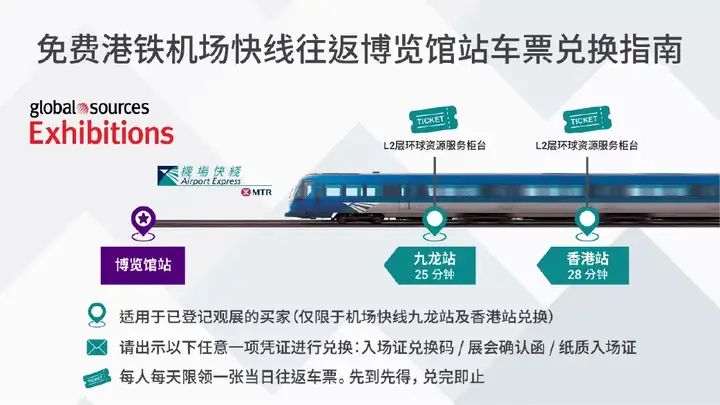 预登记买家可获得免费往返展会场馆的香港机场快线车票一张,享受从香港站或九龙站直达展馆的快捷出行。