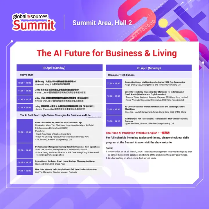 贯穿整个环球资源四月香港展的系列研讨会,旨在帮助买家制定 2026 年破局战略,拓展关键合作人脉,构筑市场竞争优势。二期研讨会将重点解读 AI 零售生态、智慧采购策略、营运效能与消费者数据,前瞻科技创新趋势。