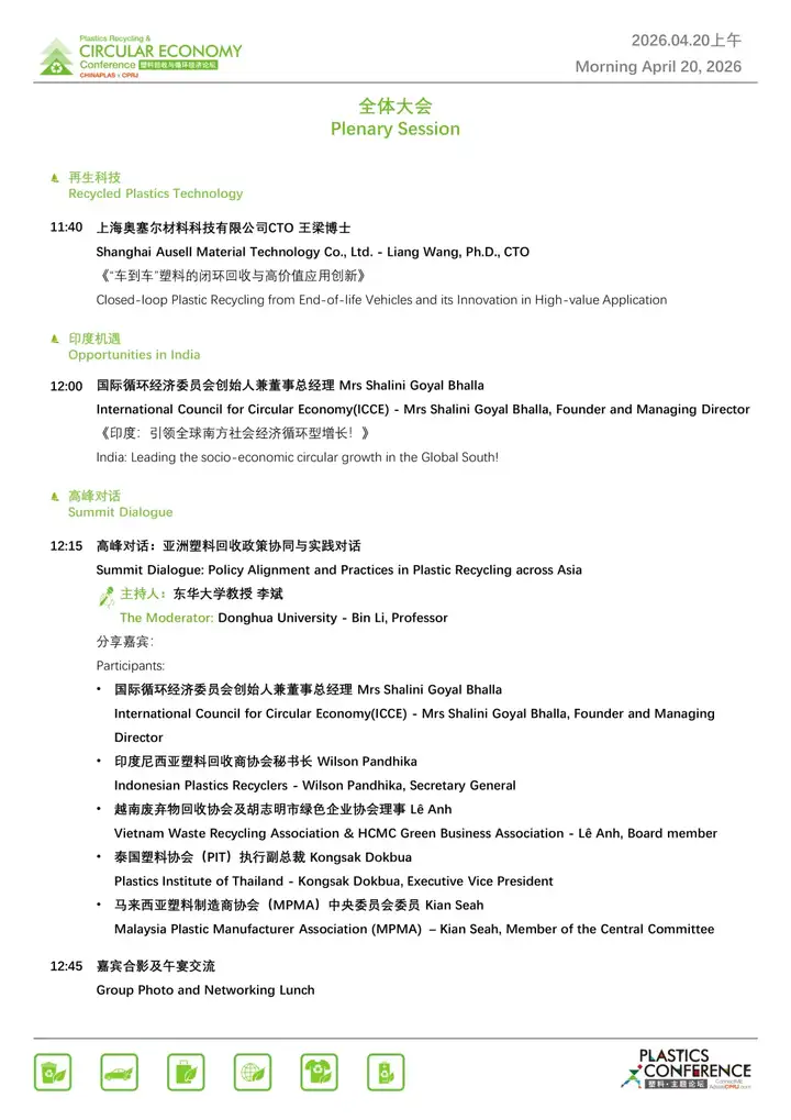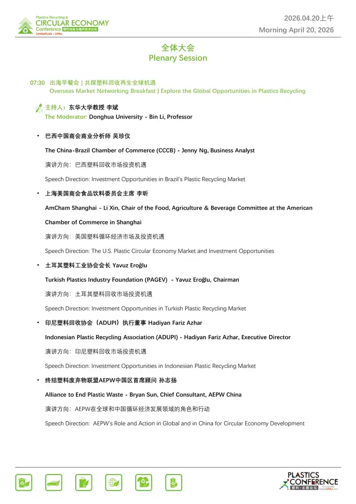 活动邀请来自欧盟、美国、英国、巴西、波黑、马来西亚、越南、印度、印度尼西亚以及中国的政府、企业、行业协会代表,通过出海早餐会、高峰对话、主题演讲、品牌展示及产业链解决方案展示等多维环节,全方位解读全球塑料回收与循环经济的政策趋势、技术创新及市场洞察。