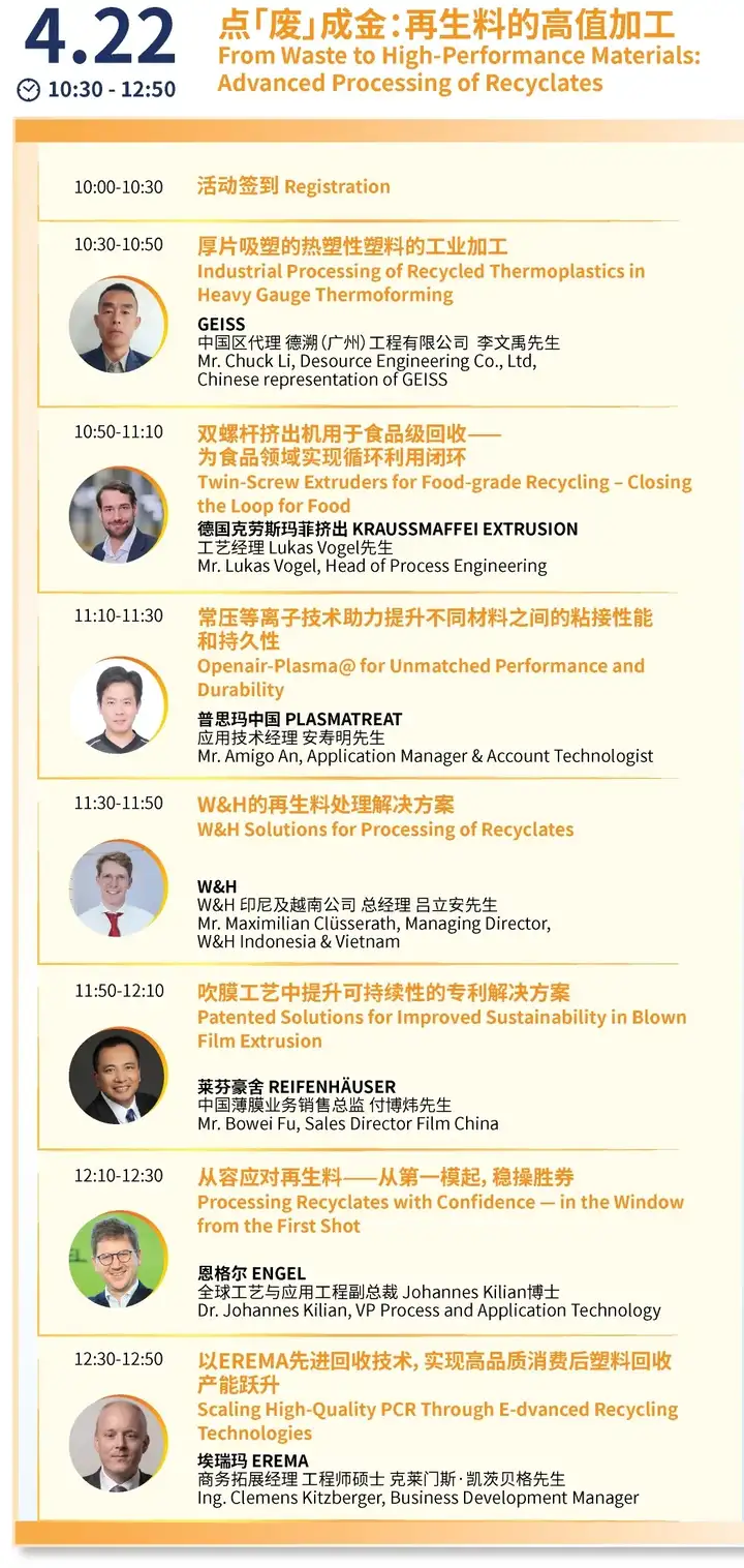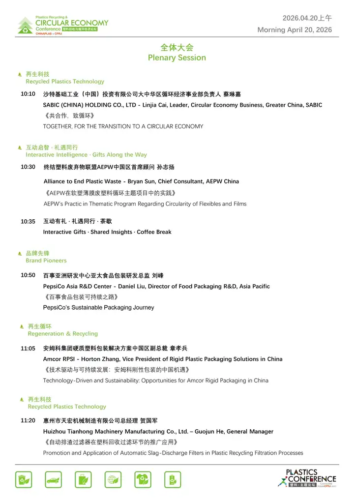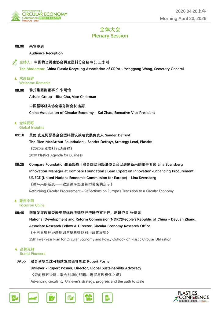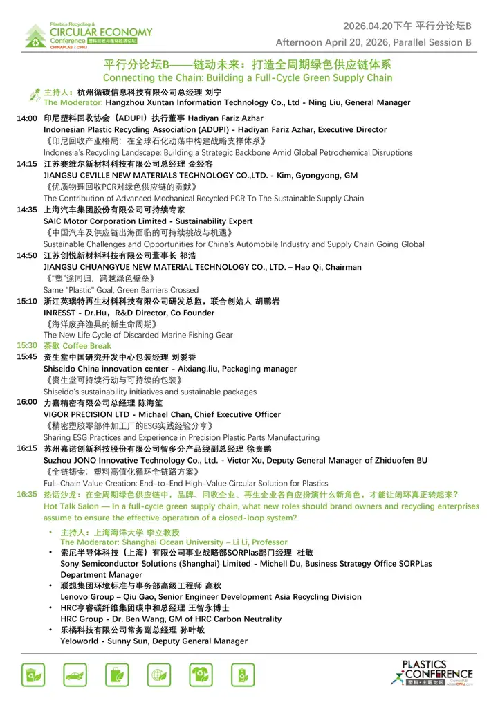 会议设置70余场热点话题分享与主题采访,聚焦塑料循环经济中的全球政策走向、低碳消费、全周期绿色供应链体系、再生材料的高值化未来等。