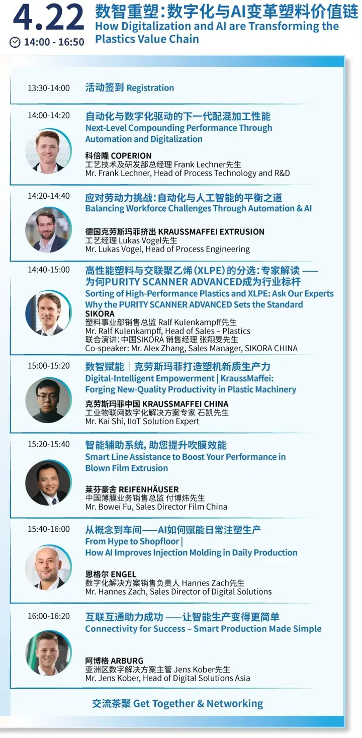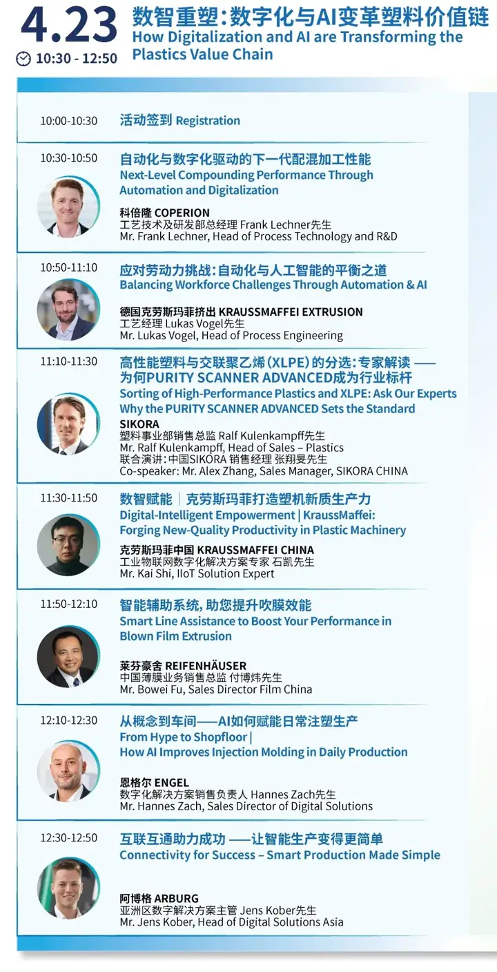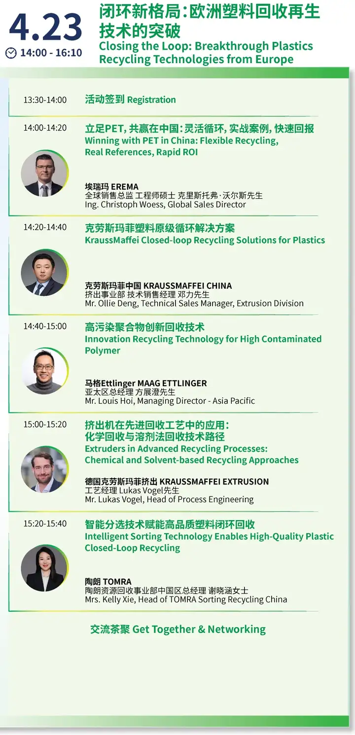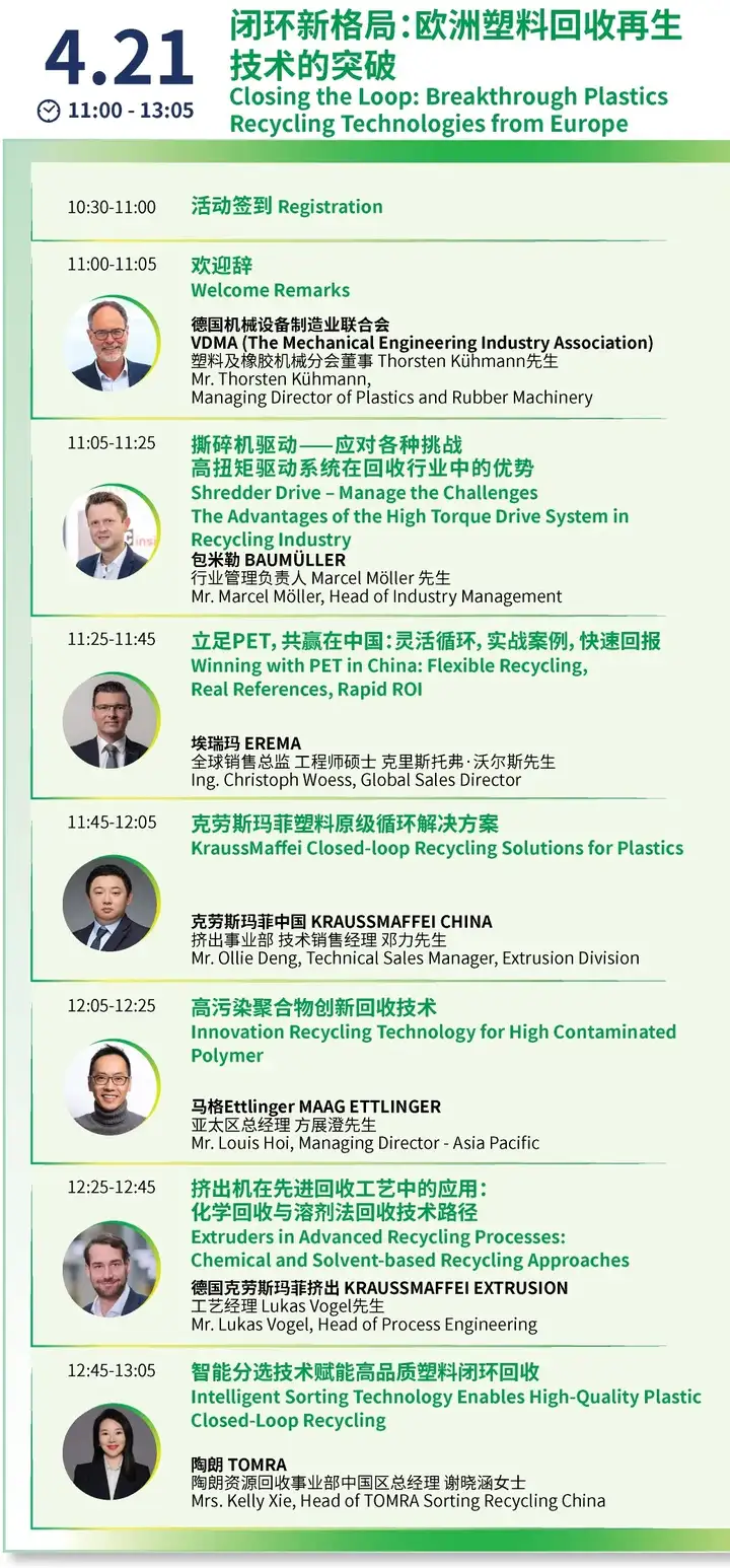 现场聆听VDMA专家与行业领袖分享尖端回收技术、再生料智能处理,以及数字孪生、产品护照等AI数字化解决方案。亲见可持续创新实践,与推动循环经济的全球同行深入交流。