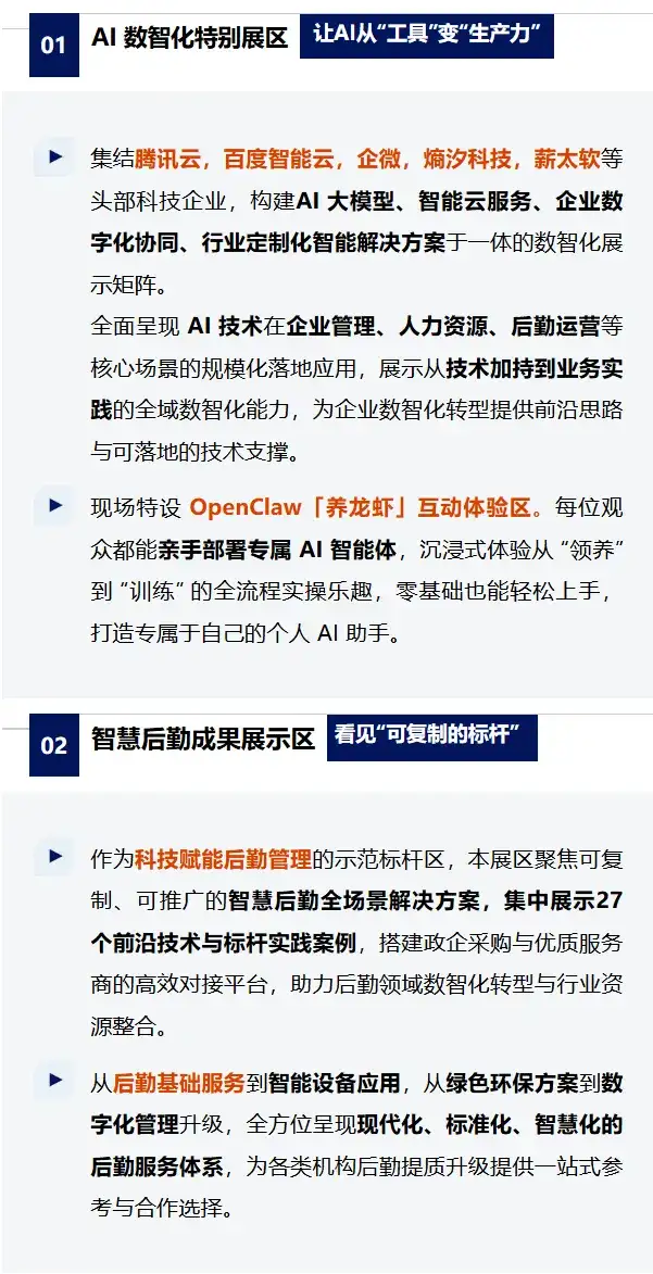 2026上海国际后勤资源采购贸易展览会围绕人力资源、企业行政、会奖商旅、AI 数智化、智慧后勤五大核心领域,百余家优质供应商将集中亮相,覆盖从单点工具服务到一体化系统解决方案的全链路能力。