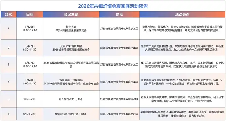 万众期待,盛事将启!2026 古镇灯博会夏季展,将于5月26-28日在中山灯都古镇会议展览中心隆重举办。作为 “一年三展” 的关键板块,展会深耕商业照明、户外文旅、跨境电商等热门领域,汇聚行业精英与优质资源,通过多场专业沙龙与精准商贸对接,为照明灯饰企业打通市场渠道、抢占年度商机提供强力支撑。