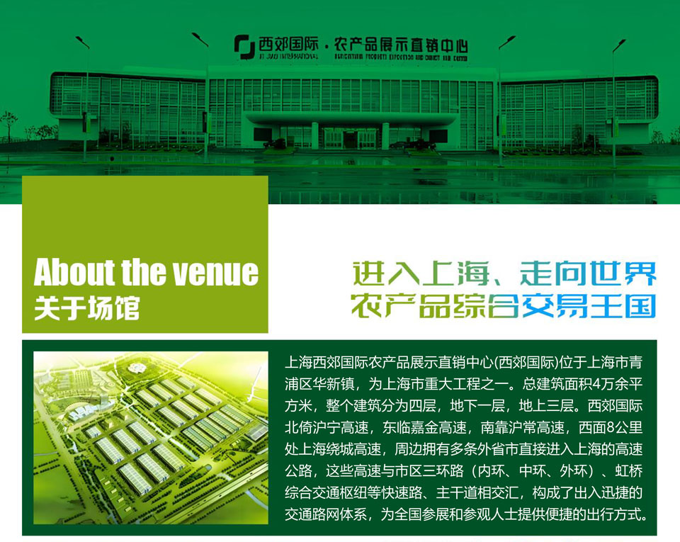 上海西郊国际农产品展示直销中心位于上海西郊青浦区华新镇,毗邻虹桥综合交通枢纽,北依京沪高速(G2),东临沈海高速(G15),西近嘉松中路,交通便捷。 展销中心荟萃国内外优质农副产品,集展示直销、看样订单、物流配送、内外贸易和电子商务等五大功能于一体,是架接农副产品产销两地的桥梁和纽带。 展销中心立足上海、辐射长三角、服务全国、连接海内外,是上海服务全国农业的大平台,是各地农副产品进入上海市场的新渠道,是上海市民购买优质农副产品的首选地。