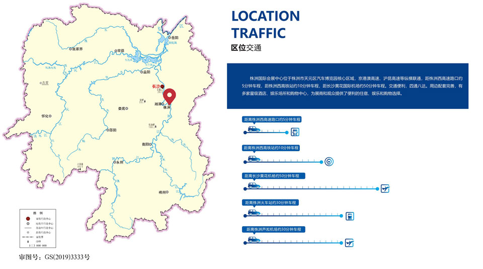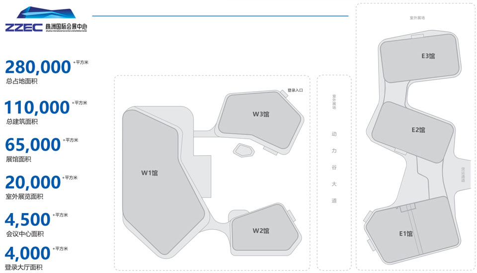 株洲国际会展中心位于株洲国家高新区--株洲汽车博览园,在京珠高速与武广高铁两高之间,地理位置优越、便捷。会展中心由 W1、W2、W3、E1、E2、E3六个展馆、室外展场、室外停车场组成,总建筑面积达110,000平方米,其中,馆内展览面积约65,000平方米,会议中心面积为4,500平方米,登录大厅面积为4,000平方米,室外展览面积约20,000平方米。所有场馆均为豪华装修,配备中央空调、灯光及现代化舞台,并可根据展会配置动力用电,设施设备一应俱全。